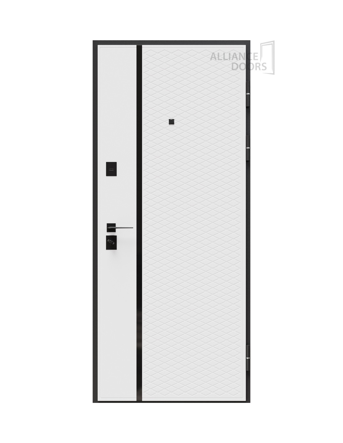 Ușă de intrare apartament în două culori: negru soft touch exterior și alb mat interior.
