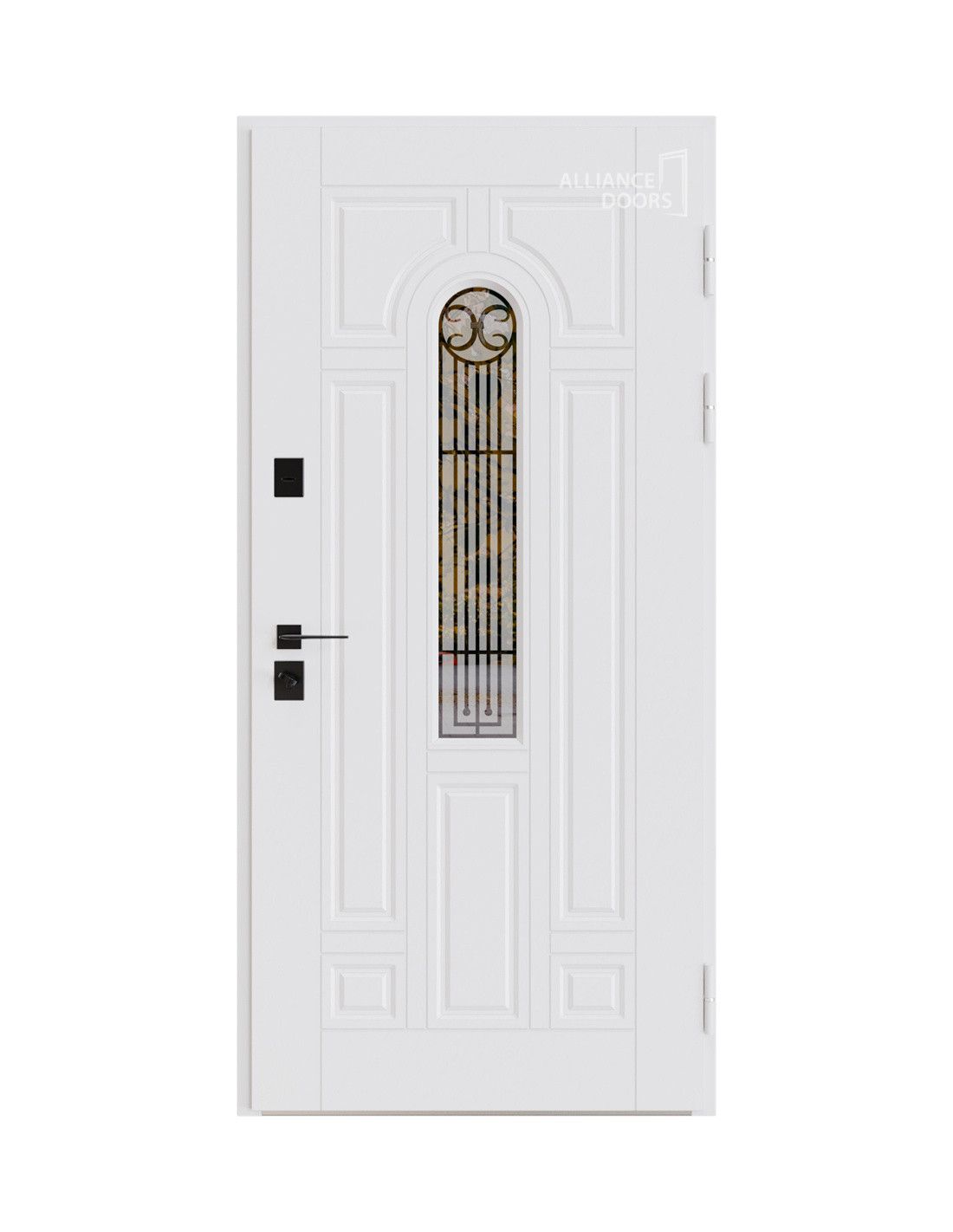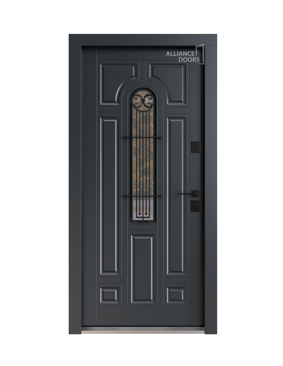 Ușa Lucia Thermo ArWood este prevăzută cu geam termopan cu 3 camere (4 sticle) și element de decor din fier forjat - culoarea negru.