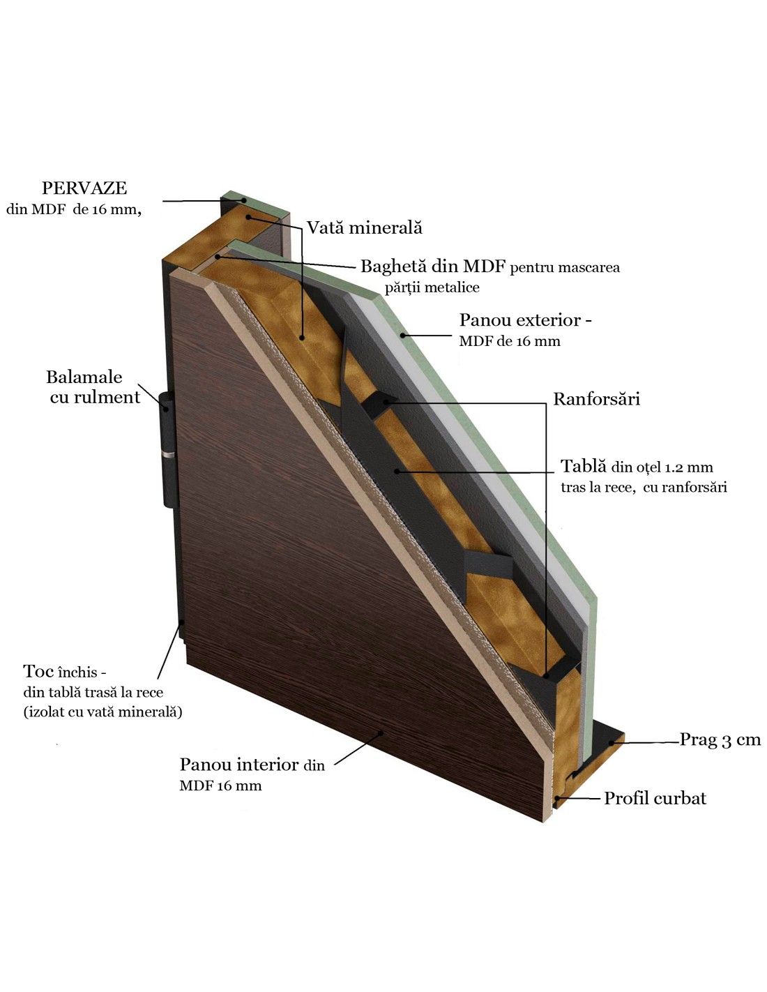 Izolație Completă: Foaia de ușă și tocul de 100 mm sunt umplute cu vată minerală, asigurând o barieră termică și fonică de excepție.