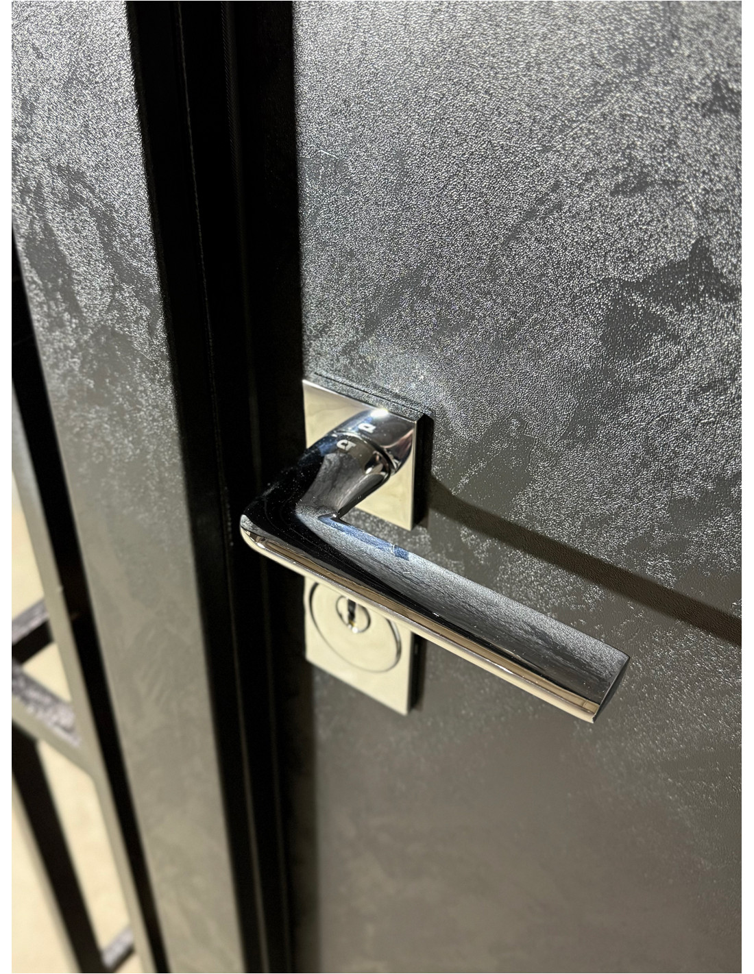 Armonie Vizuală: Încuietorile și feroneria tip pătrat, în culoare crom lucios, contrastează elegant cu negrul profund al foii de ușă, subliniind calitatea premium.